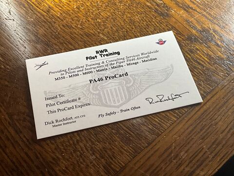 Pilots who develop and retain ATP level skills and knowledge are awarded the coveted PA46 ProCard from RWR Pilot Training. This acknowledgement additionally provides lower minimums when complying with the PA46 standard operating procedures. Insurance underwriters have honored the bearer of this card with discounts in the past. Training to the highest standard doesn’t cost any more and it will make you a more confident and competent pilot. It may even save your life.